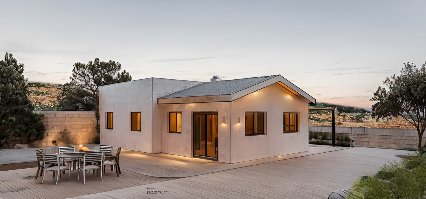 הבית תוכנן עבור משפחה מקסימה וצעירה. הבית נועד לשמש כמגורים ראשוניים למספר שנים ובהמשך להפוך ליחידת דיור צמודה לבית הראשי שעתיד להיבנות במגרש. המבנה תוכנון כשתי קוביות: הקידמית משמשת כחלל ציבורי וכוללת בתוכה את מבואת הכניסה, סלון, פינת אוכל ומטבח. בעלת גג משופע, תקרה פנימית גבוהה וחלונות הצופים אל כיוון הנוף המדהים של איזור השפלה ומישור החוף. האחורית משמשת כחלל פרטי יותר וכוללת את חדרי השינה/משפחה, חדרי רחצה ואיזור כביסה. מיועד להרחבה עתידית.